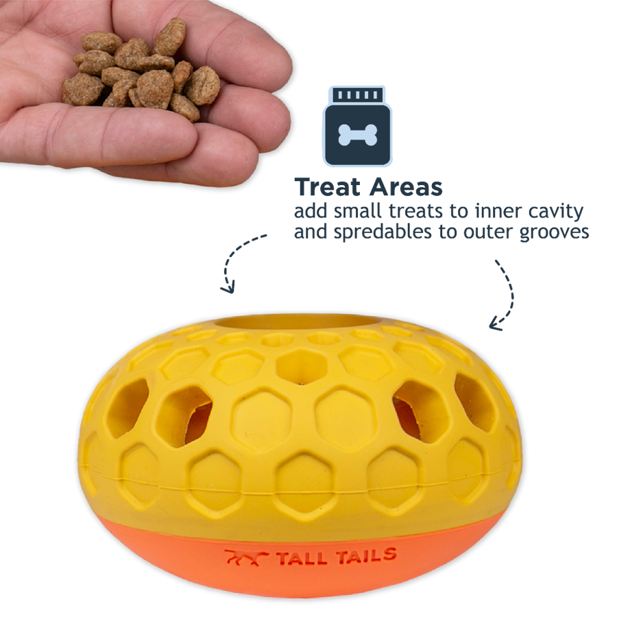 The Natural Rubber Bee Hive Reward Dog Toy is crafted from rugged and flexible natural rubber, providing a stimulating mental and physical playtime for your furry friend. Your pup can lick and nudge the toy to their heart's content while being rewarded with treats that shake out as they play. The inner retention sleeve helps keep all the treats from pouring out of the top when flipped over. This toy is perfect for dogs who enjoy a fun challenge and can easily be cleaned in the dishwasher's top rack after use.